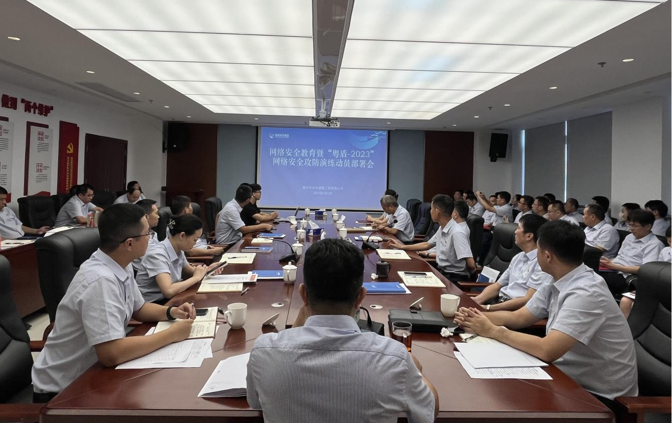 8月4日,市水電公司在1419會議室召開網(wǎng)絡安全教育暨“粵盾-2023”網(wǎng)絡安全攻防演練動員部署會,公司領(lǐng)導班子成員、機關(guān)黨支部全體黨員參加會議。本次會議由公司副總經(jīng)理、總工程師、教授級高級工程師張建平主持,特邀廣東易隆科技有限公司開展網(wǎng)絡安全教育培訓。