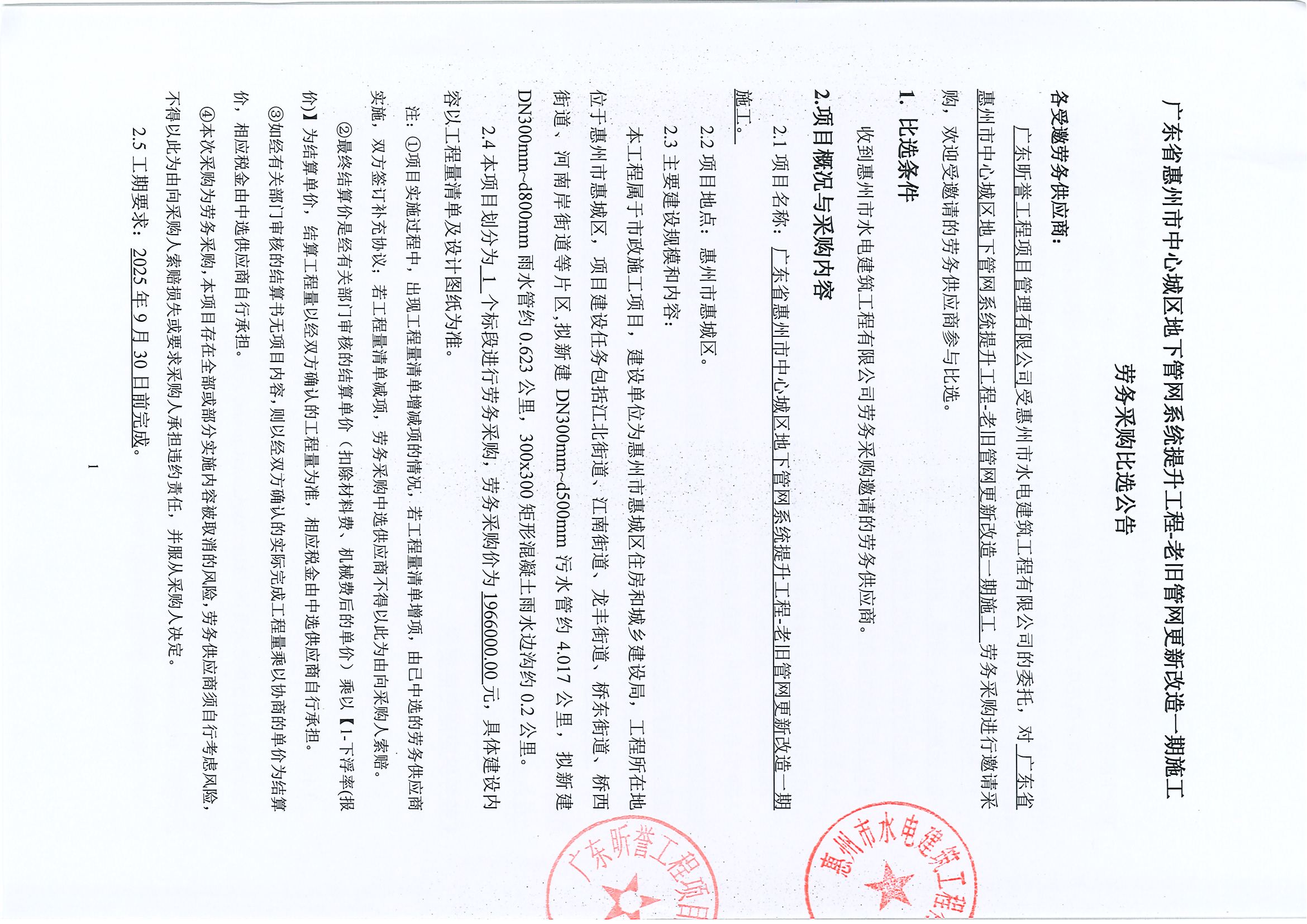 廣東省惠州市中心城區(qū)地下管網(wǎng)系統(tǒng)提升工程-老舊管網(wǎng)更新改造一期施工勞務(wù)采購比選公告