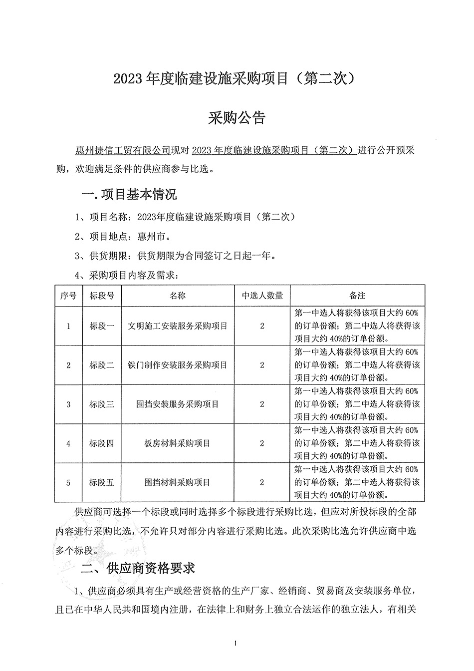 捷信工貿(mào)公司2023年度臨建設(shè)施采購(gòu)項(xiàng)目(第二次)采購(gòu)公告