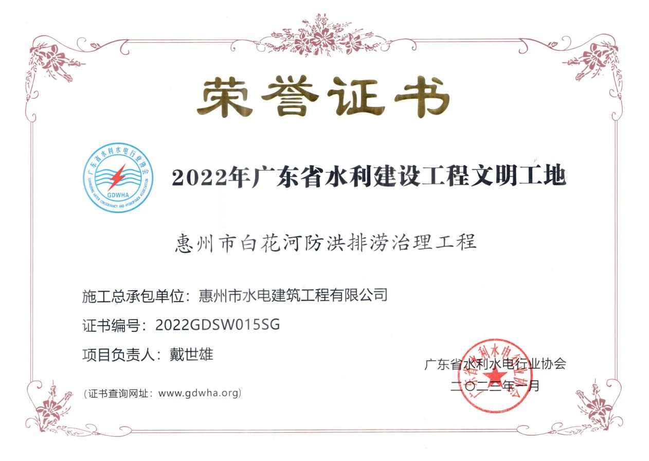近日,我司承建的惠州市白花河防洪排澇治理工程經(jīng)廣東省水利水電行業(yè)協(xié)會(huì)組織行業(yè)專家評(píng)審組評(píng)審?fù)ㄟ^,順利獲得“2022年廣東省水利建設(shè)工程文明工地”榮譽(yù)稱號(hào)。這是公司貫徹落實(shí)市水務(wù)集團(tuán)精細(xì)管理要求,不斷拓展高質(zhì)量發(fā)展空間的又一工作成果。