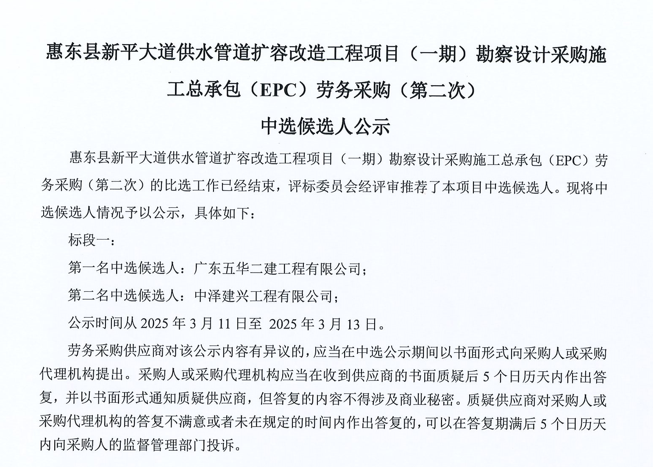 惠東縣新平大道供水管道擴(kuò)容改造工程項(xiàng)目(一期)勘察設(shè)計(jì)采購施工總承包(EPC)勞務(wù)采購(第二次)中選候選人公示......