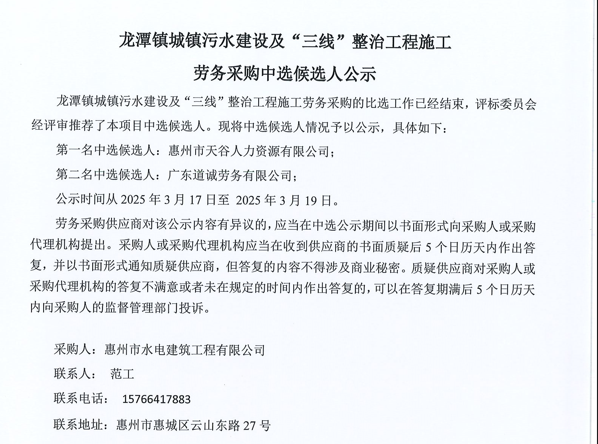 龍?zhí)舵?zhèn)城鎮(zhèn)污水建設(shè)及“三線”整治工程施工勞務(wù)采購中選候選人公示......
