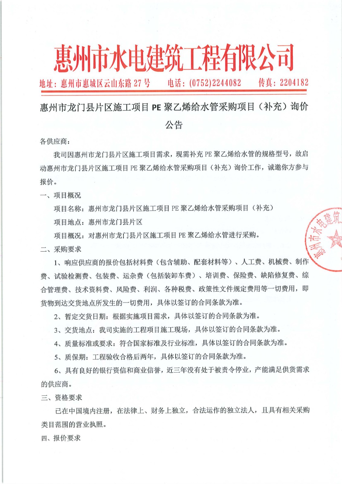 惠州市龍門縣片區(qū)施工項目PE聚乙烯給水管采購項目(補充)詢價公告附件:/upload/202502/27/202502271448126455.xls......